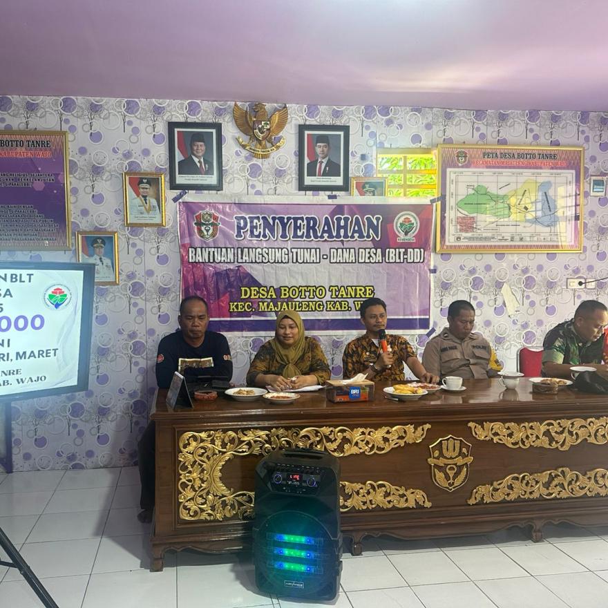 Botto Tanre, Majauleng Pemerintah Desa Botto Tanre, Kecamatan Majauleng, Kabupaten Wajo, melaksanakan kegiatan penyaluran Bantuan Langsung Tunai (BLT) Dana Desa untuk Triwulan I dan II Tahun 2025, yang mencakup bulan Januari hingga Juni. Penyaluran bantuan ini dilaksanakan pada hari Jumat, 09 Mei 2025 bertempat di Kantor Desa Botto Tanre.